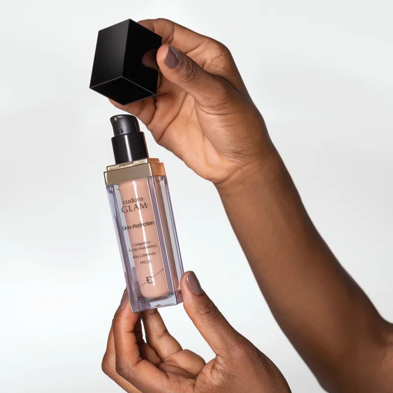 A Base Líquida Glam Skin Perfection traz alta cobertura, tratamento e tecnologia para uma pele mais firme e preenchida. Inovadora, conta com o poder da alta cobertura e efeito mate, aliada ao duplo tratamento do Colágeno , que recupera a elasticidade da pele, e o Ácido Hialurônico , que preenche e reduz linhas finas e rugas. A cor 05 é uma base de intensidade de cor clara que faz parte das 20 cores da linha para combinar com os diversos tons de pele , sendo uma ótima opção de base para a pele branca . Escolha a sua cor e conquiste o efeito desejado! Confira mais benefícios. -Cobertura Média/Alta; -Longa duração impecável; -Não transfere; -FPS 25/UVA ++; -Controle de oleosidade ao longo do dia; -Resistência à água e ao suor . Essa base Eudora conta com a Tecnologia 3X Protect: além do poder do Hialurônico , com ação Prebiótica que estimula a defesa natural da pele e antipoluição que protege dos radicais livres. A combinação desses ingredientes promove máxima proteção com ação reparadora, mantendo a integridade da barreira cutânea após 7 dias de aplicação contínua . Skin Perfection é mais que maquiagem, é tratamento e tecnologia. Nenhum produto Eudora é testado em animais, ou seja, este item possui selo Cruelty Free.