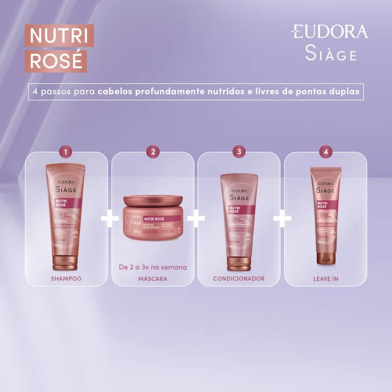 A Máscara Capilar Siàge Nutri Rosé hidrata profundamente e repara as áreas fragilizadas dos fios por todo seu comprimento. Sua fórmula com Elixir de Rosas , entrega um ativo poderoso obtido através da colheita de 30 mil pétalas de rosas que garantem a reparação dos fios por inteiro. Com o incrível Efeito Anti-tesoura não será mais necessário recorrer ao corte para ter cabelos lindos e saudáveis. Além de devolver sua resistência natural, evitando que eles se quebrem facilmente. Proporciona cabelos com toque macio, mais resistentes, com brilho natural e benefícios como: Nutrição profunda até a 3ª camada do fio;Reparação instantânea e duradoura, sem pesar;Raiz saudável e comprimento livre de pontas duplas;Livre de Petrolatos, Parabenos e Sal. A Máscara Capilar Siàge Nutri Rosé chegou para você dizer adeus às tesouras! SOBRE A LINHA A linha Siàge Nutri Rosé é enriquecida com um poderoso Elixir de Rosas , rico em vitaminas e antioxidantes que nutrem os fios e tem alto poder de reparação, combinado a natural Argila Vermelha que nutre os fios, promovendo equilíbrio ao couro cabeludo e reparação profunda da raíz às pontas. Nenhum produto Eudora é testado em animais, ou seja, este item possui selo Cruelty Free.