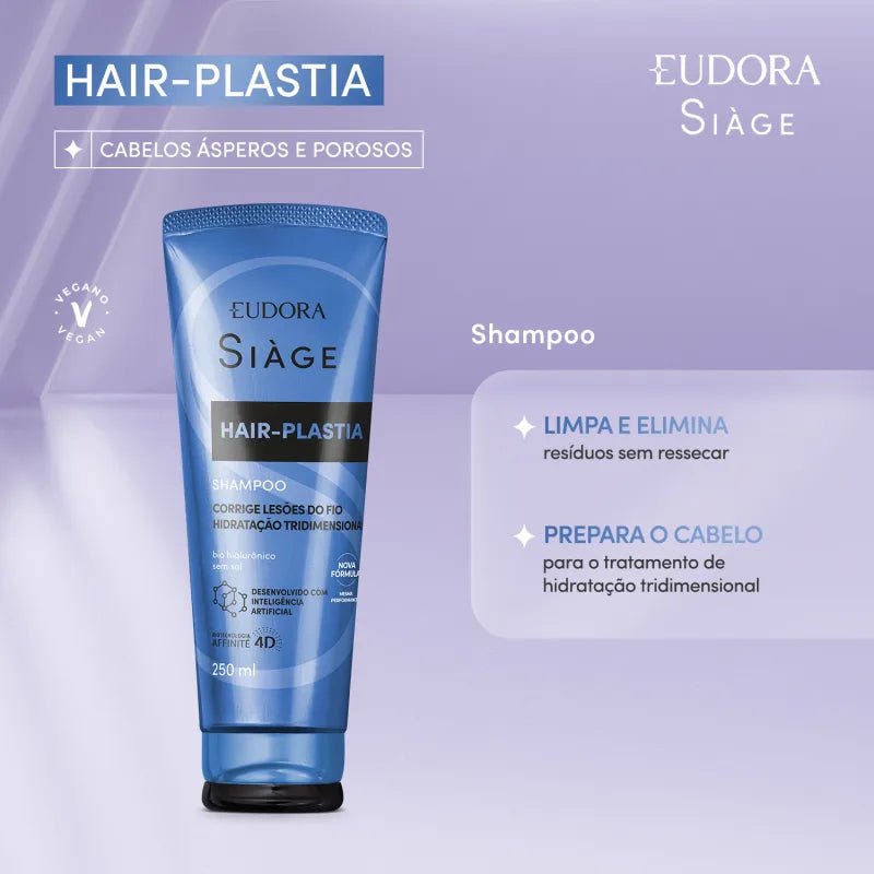 Hair-Plastia é a linha mais tecnológica Siáge, atuando diretamente na estrutura do fio para promover uma verdadeira plástica capilar e corrigir as lesões do cabelo. Livre de Parabenos, Petrolatos, Corantes e Sal, o Shampoo Hair-Plastia limpa e elimina resíduos suavemente, sem ressecar as madeixas. Com Bio Hialurônico em sua fórmula, este shampoo eudora oferece hidratação tridimensional, que age em todas as camadas do fio, devolvendo vida e densidade ao seu cabelo. Benefícios: Melhora a qualidade do cabelo desde o 1º uso; Fios mais encorpados desde a 1ª aplicação; Age de dentro para fora, preenchendo a fibra capilar; Cabelos extremamente macios e brilhantes. Saiba mais sobre a linha Siàge Hair-Plastia: Desenvolvido com Inteligência Artificial e Bio Hialurônico, Siàge Hair-Plastia é tecnologia para o seu melhor cabelo, todos os dias. A Inteligência Artificial combinou milhares de dados e estudou o comportamento das pessoas para atender com precisão as necessidades das consumidoras. Nenhum produto Eudora é testado em animais. Ingredientes atualizados na data desta publicação. Mas é importante lembrar de sempre verificar a embalagem, a informação mais atual é a do rótulo do produto.